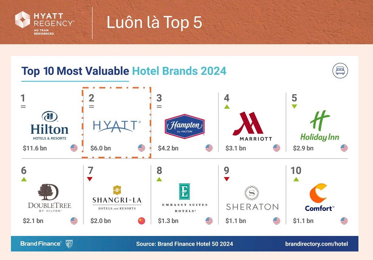 HYATT luôn nằm trong Top 5 tập đoàn khách sạn lớn nhất thế giới cùng với Marriott, Hilton, IHG và Accor, được vinh danh nhiều năm liền trong danh sách World’s Best Hospitality Brands.